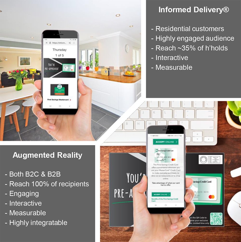 All benefits derived from Informed Delivery® is done so from a digital version of a direct mail piece, Augmented Reality on the other hand provides the same benefits (and more) directly from the printed mail piece.