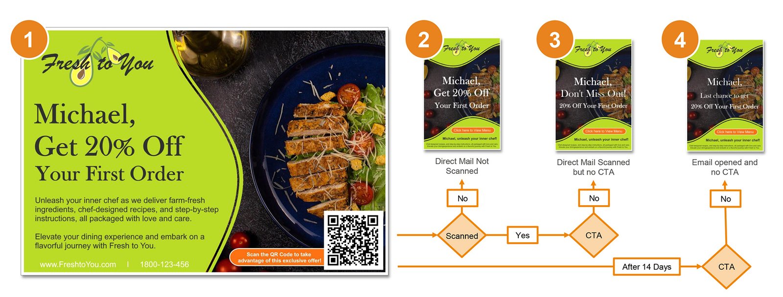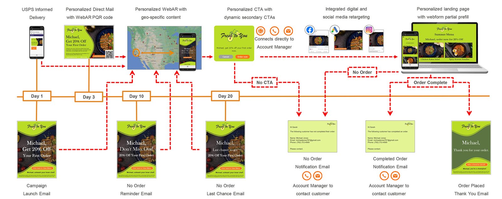 An example of what can be achieved using USPS Informed Delivery, Addressed Mail, Digital Retargeting, Geo-Content and Integrated Email Modules in parallel.