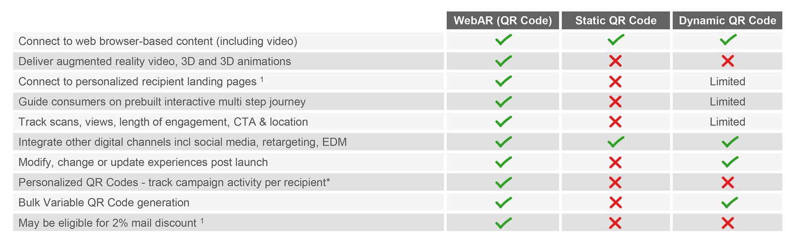 The following table provides a quick overview on the different features of WebAR vs. QR codes.