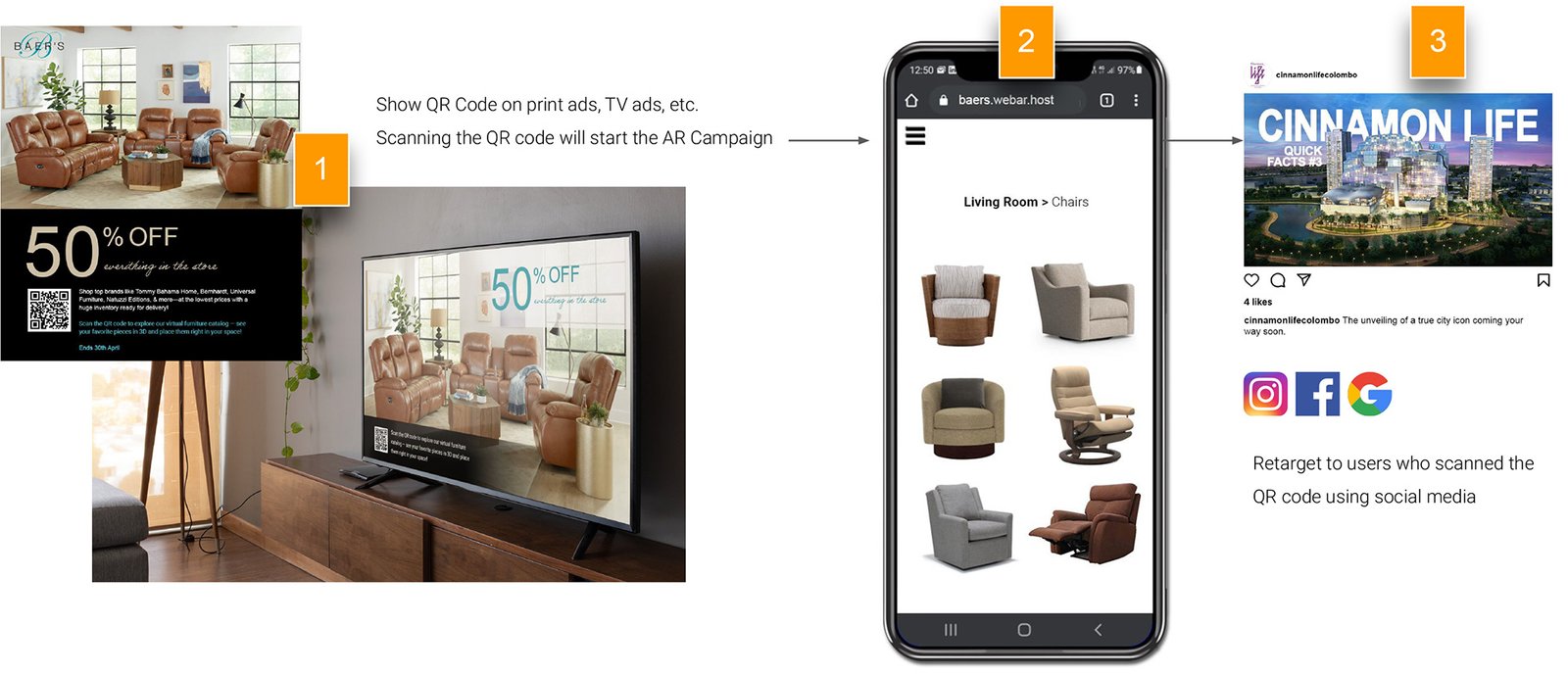 Deliver WebAR from your print as well as TV ads. Find out how and from where your customers are engaging from and connect them with your digital advertising by retargeting them via social media and Google ads.